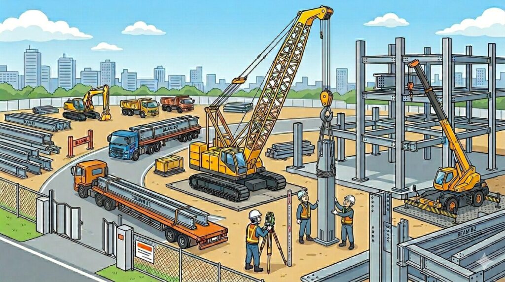 第8回【鉄骨建方のクレーン選定と搬入計画】5つの建方方式と建入れ直しの実務