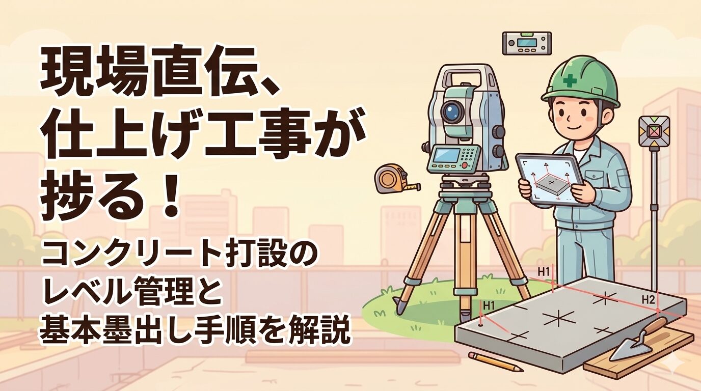 この記事を最後まで読めば、コン天の管理から屋上の難しい勾配、さらには仕上げにつながる5つの基本墨出しまで、自信を持ってコントロールできるようになります。