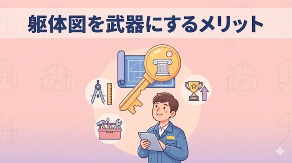 躯体図は現場の職人さんが実際に建物を造るための「設計図」であり、自分だけが理解できる表現では意味がありません。寸法や記号の配置など、誰が見ても一目で施工内容が正しく伝わる「親切な図面」を心がけることが、現場のミスや手戻りを防ぐ最大のポイントです。